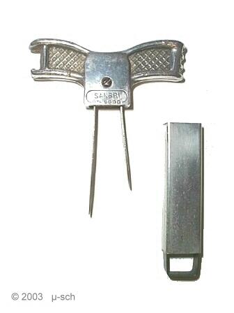 Prong puller with cap lifter, sheath made out of alu tin and Extra-prongs.